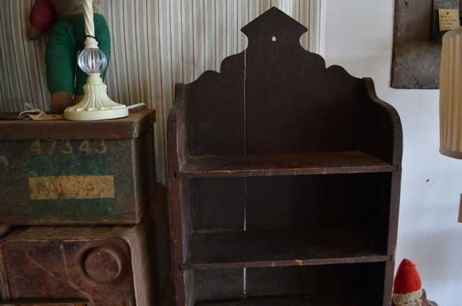 Beautiful cedar church shelves with lovely brown aged paint and decorative pattern. Found locally. Dimensions 150 mm D X 400 mm W x 650 mm H.
