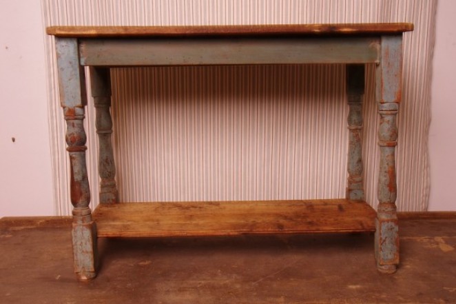 A beautiful side table with rustic bush charm and the victorian style. Found in a shearing shed, this table was used by the shearers for their “smoko”. The legs have a stunning blue colouring and the pine top displays all the signs of use by the shearers. C 1880.