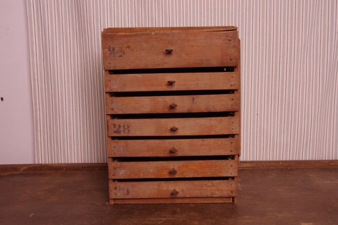 A classic depression vacum oil box with 7 drawers. Eye hook handles and numbered drawers.