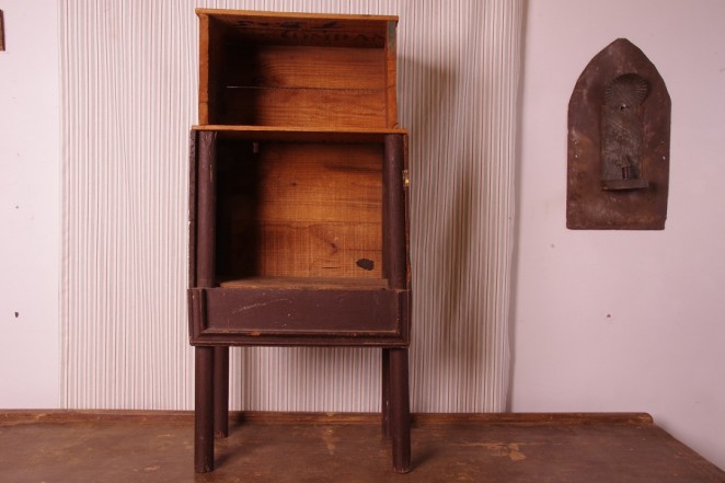 Unique 1920′s petrol box depression cupboard. This piece was made from 2 boxes however, the round legs were added to continue through into the lower box as a decorative feature and strength. The lower box was also embellished with moulding to enhance its appearance. Yea, Victoria. Price $320.00