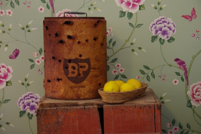 BP 20 Litre can with bullet holes