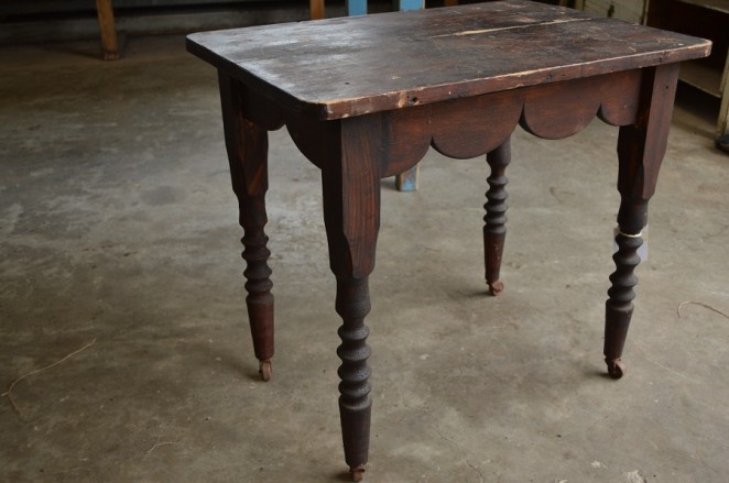 This is a real gem. Beautiful decorative side table on carved legs on casters. Original stain with a lovely patina. From the goldfields of Central Victoria in Newstead region. Dimensions 60cm H x 45cm D x 66.5cm W. Price $180.00