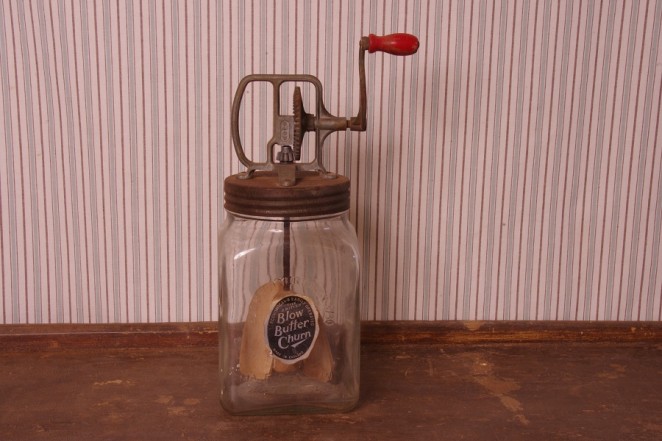 A c1900 glass Blow butter churn from England. Working mechanism with wooden paddle. Fantastic decorative item.