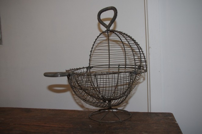 A lovely piece of early Australian Kitchenalia – wire egg holder in excellent condition. The two handled egg holder can be formed into a bowl or enclosed. Found in the Colac region, Victoria.
