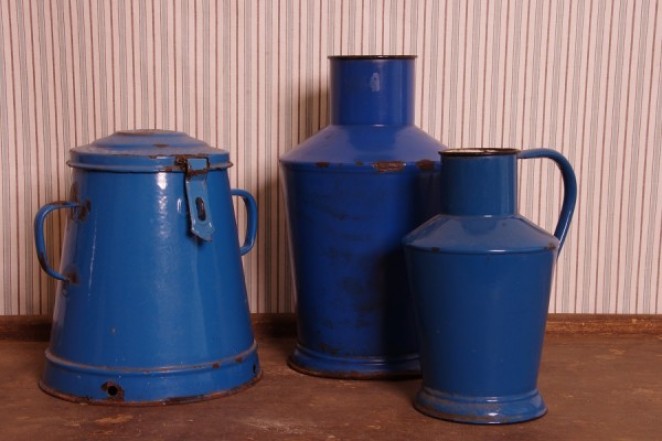 Visually stunning collection of milk containers from Eastern Europe. The bright blue will brighten and add spark to any kitchen.