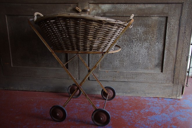 A beautiful early laundry trolley with original cane laundry basket.