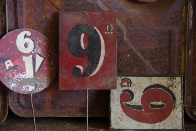 colourful collection of early metal price tags.