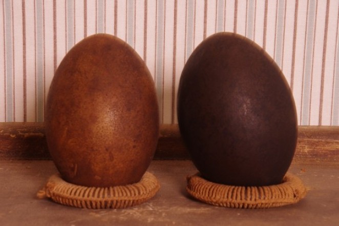 Interesting pair of emu eggs c1930 on metal stand wrapped with string. The eggs have not been drained. Beautiful decorative pieces. Ex private colonial museum – Mildura. Will separate.