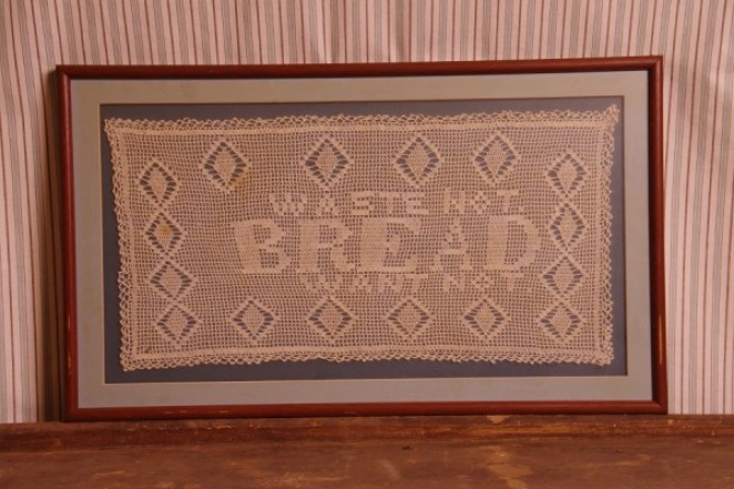 Beautiful hand woven lace with embroidery – “Waste not. Bread. Want not”, framed. A wonderful piece of Australiana C 1910 from North West Victoria. Price $180.00
