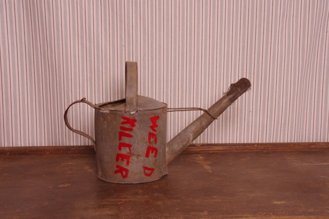 An interesting conversion. A once flower bed watering can converted to a can for weed killing. The funnel has been covered in mesh to act as a strainer. Ideal decorative piece.C 1940’s. Sunbury. Victoria.