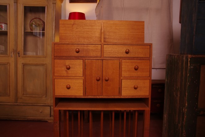 This is one of the best hardwood cabinets I have seen. Made in Feb 1982 by Robert Wilson, Mildura, Victoria it was purchased from a colonial museum collected for its craftmanship. This beautiful dark honey coloured piece contains 6 drawers, 1 shelf, 2 door cupboard and storage rack for records or magazines. This is a timeless piece suitable in any period or modern home. Dimensions W710 H1310 D430.