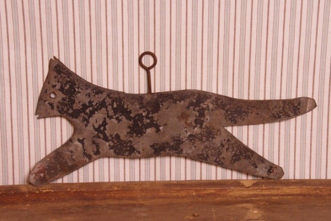 This is truely a rare piece. Late c 1920’s depression era tin scare cat with original black paint and eye hook. Scare cats were used primarily to frighten birds from the garden, particularly orchards or over newly sewn seeds. The tin cat was tied with string or wire off a tree branch and swing in the breeze giving an illusion of a live cat. In this example,the cat is running or about to pounce. The punched hole eyes equally gave the effect of menacing eyes.