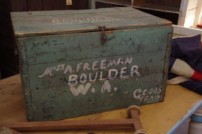 Beautiful pine chest painted in a stunning muted green from Boulder, Western Australia – Hand writing “Miss. A. Freeman. BOULDER W.A”” – Goods Train.