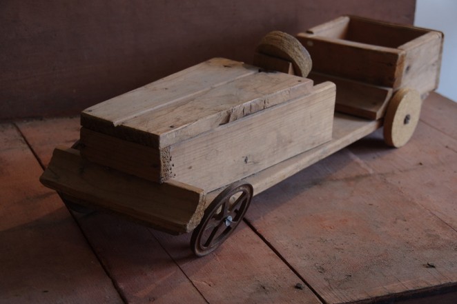 Rustic home made wooden child’s toy car.