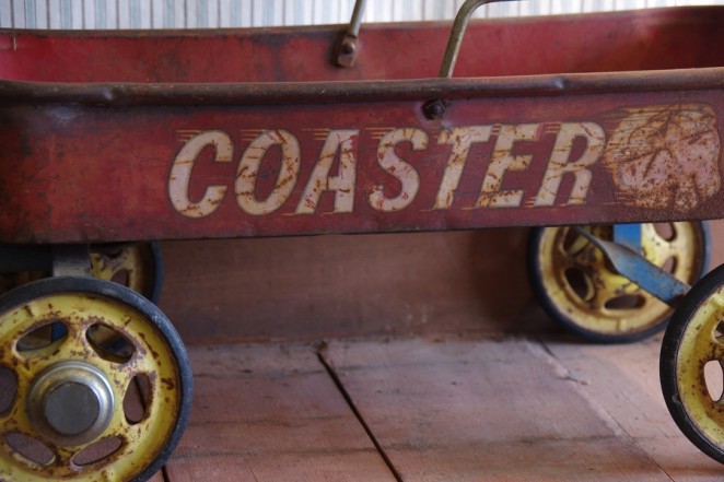 This is a real treasure – 4 wheeled child’s metal cart/trolley, “”The Coaster””. Stunning colouring and in wonderful condition. C 1950’S.