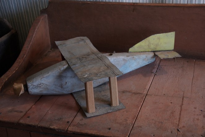A hand made toy tin and wooden plane.