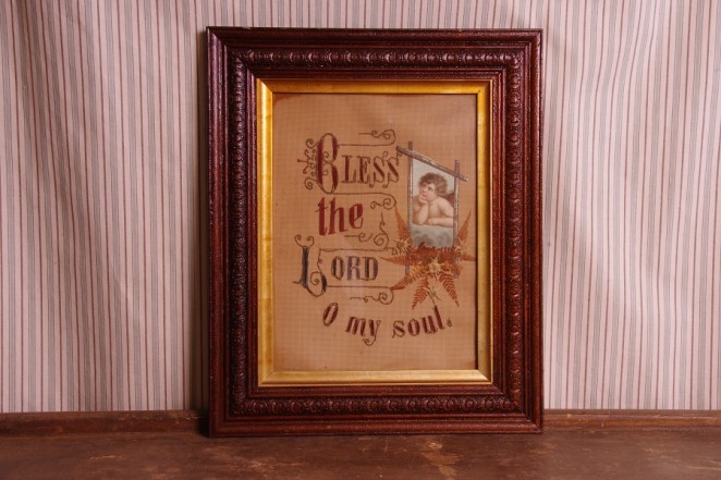Framed Victorian embroidery with timber frame – “Bless the Lord, O my soul”. A beautiful piece.